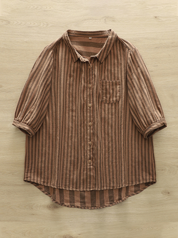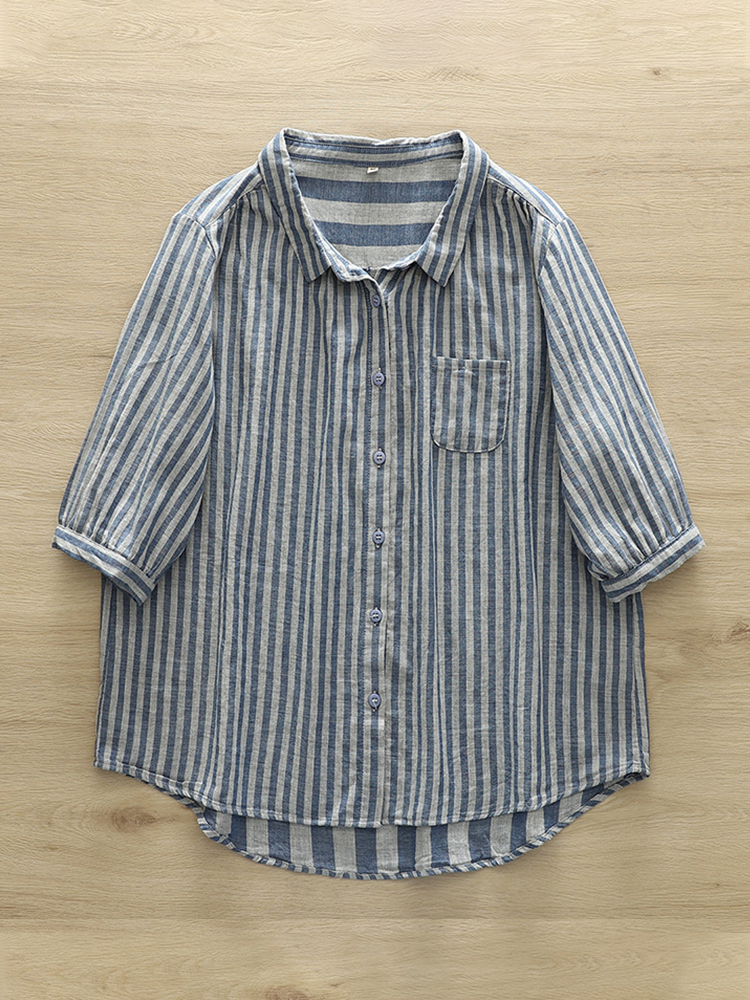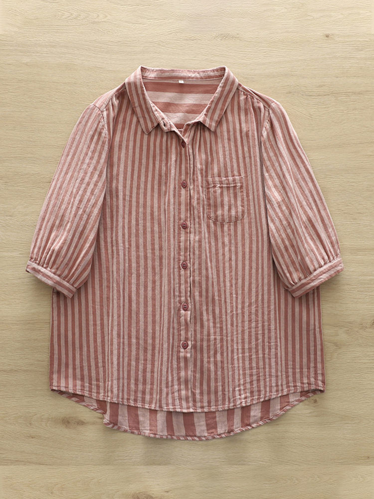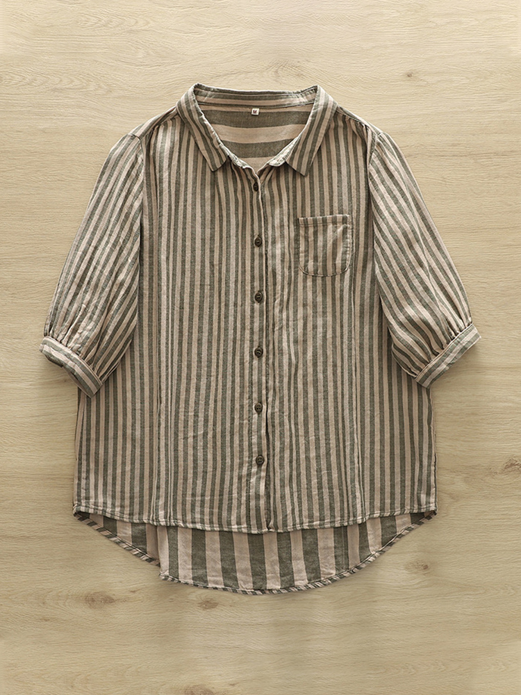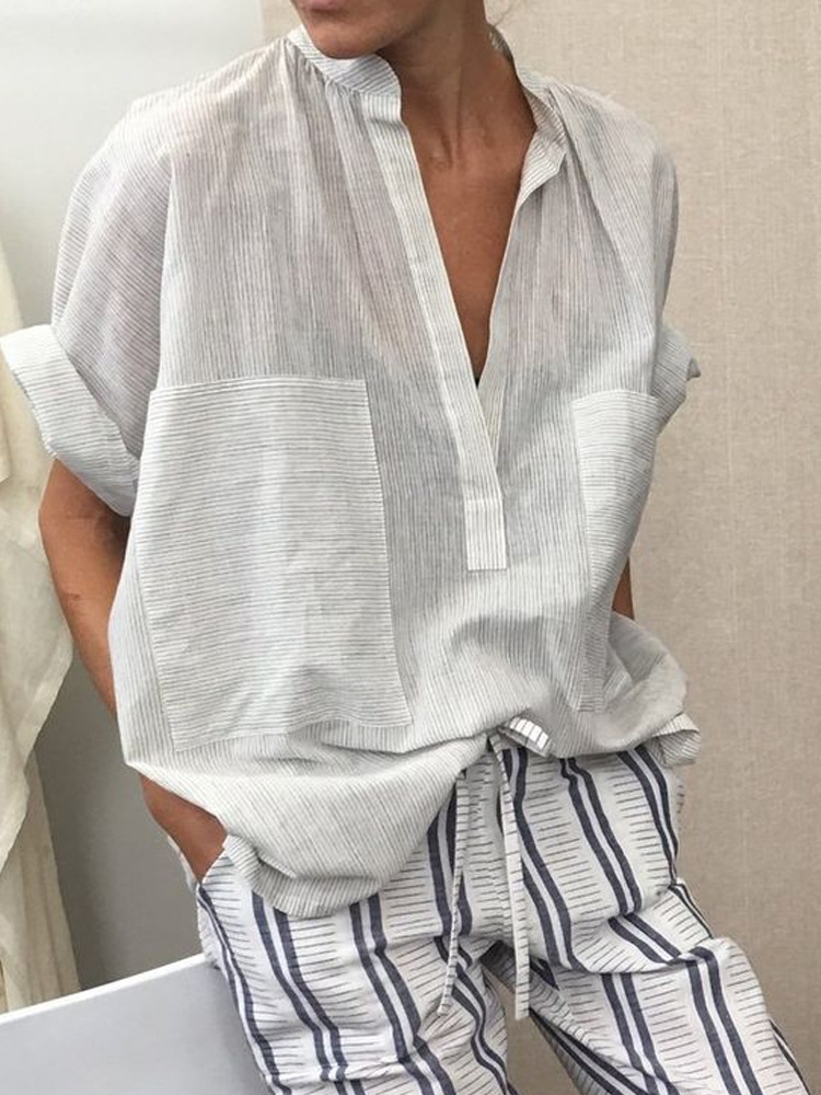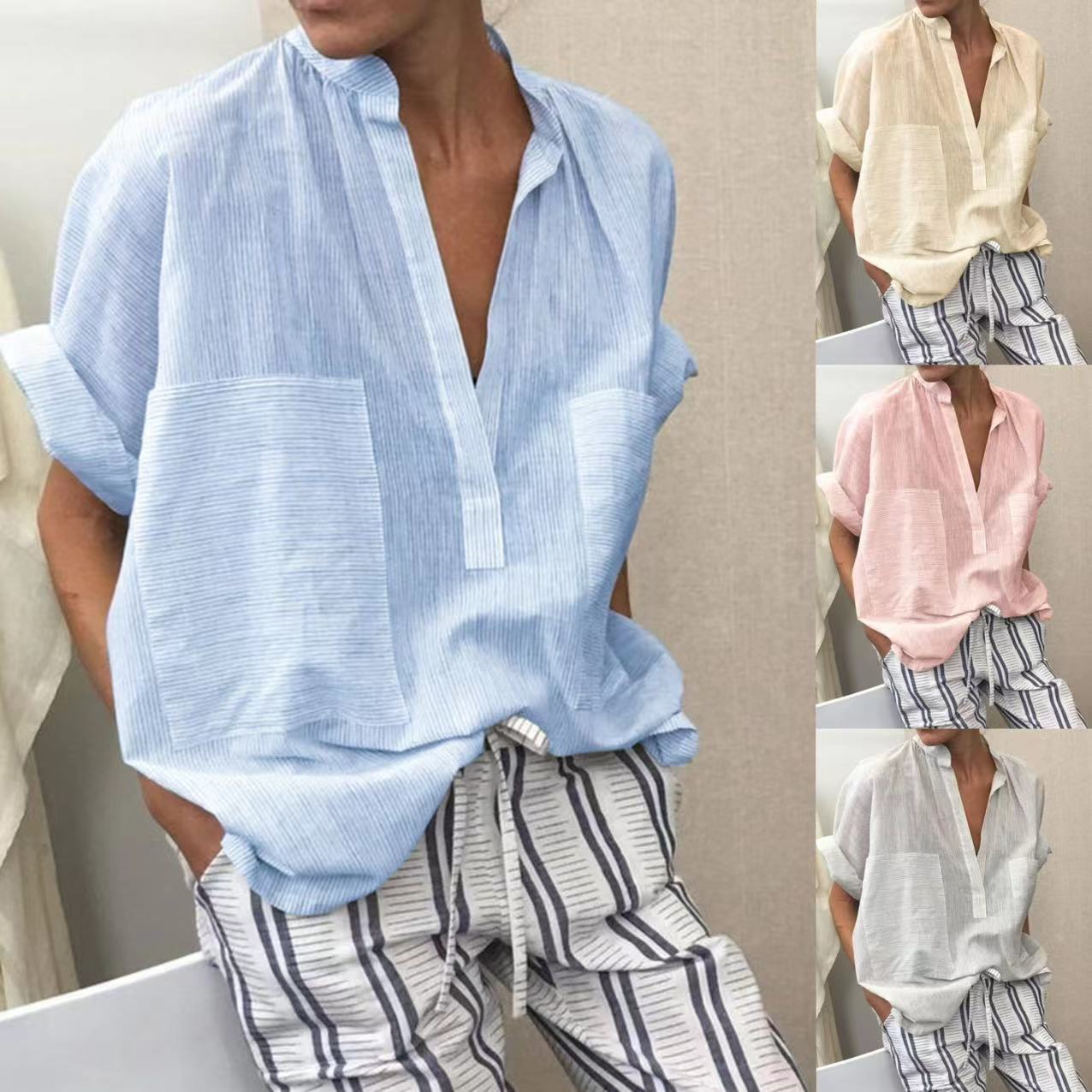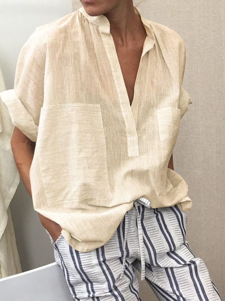 Women's casual fashion solid color striped pocket V-neck shirt